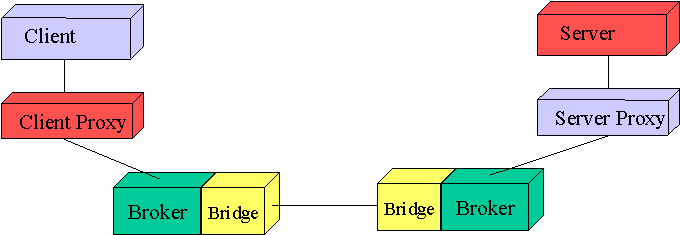 Im bisherigen Szenario war stillschweigend vorausgesetzt, daß in einem Netz nur ein einzelner Broker verfügbar ist. In der Praxis macht eine solche Annahme schon aus Skalierbarkeitsgründen nur wenig Sinn. Stattdessen ist ein Netz verteilter Broker-Komponenten wahrscheinlicher, die miteinander netzweit kooperieren. Etwa, um Client-Aufrufe über Broker-Grenzen hinweg weiter zu vermitteln. Da es sich bei den kooperierenden Brokern um unterschiedliche Lösungen handeln kann (unterschiedliche Hersteller, unterschiedliche Betriebssysteme), bedarf es zu diesem Zweck einer gemeinsamen Sprache. Sogenannte Bridge-Komponenten erfüllen diese Aufgabe, indem sie das lokale Protokoll des Brokers in ein gemeinsames Interoperabilitätsprotokoll übersetzen.