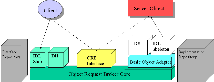 Als zentraler Bestandteil innerhalb dieser Architektur dient der sogenannte ORB (Object Request Broker). Zu seinen Aufgaben gehört die Weitervermittlung von Methodenaufrufen vom Client an die Server-Objekte, sowie die Übergabe der Resultate und Fehlerbedingungen an den aufrufenden Client. Da der Broker das Herzstück der gesamten Architektur darstellt, erfolgte seine Standardisierung notwendigerweise zuerst. Diese Komponente trägt heute den allseits etablierten Namen CORBA (Common Object Request Broker Architecture).
