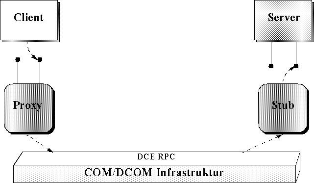 Damit allein ist es aber noch nicht getan. Würden in einer Tabelle die Methodenzeiger direkt auf die Implementierung der Schnittstelle im COM-Objekt verweisen, wäre lediglich ein Zugriff auf lokale Objekte möglich, deren Realisierung iin Gestalt dynamisch ladbarer Bibliotheken (DLLs) vorliegt – diese werden zur Laufzeit dynamisch in den Adreßraum des Client eingebunden. Mit Hilfe sogenannter Proxies läßt sich diese Einschränkung jedoch umgehen. Möchte ein Client auf ein Objekt zugreifen, das sich in einem anderen Prozeß befindet und zum Beispiel als ausführbares Programm vorliegt, lassen sich sogenannte Proxies einsetzen (siehe Abb. Broker) . Ein Proxy implementiert dabei exakt dieselben Schnittstellen wie das ihm zugeordnete COM-Objekt, liegt aber im Gegensatz zu dem eigentlichen Zielobjekt als dynamisch ladbare Bibliohek vor. Die Methodenzeiger des Clients verweisen nicht mehr auf die eigentliche Schnittstellenimplementierung des COM-Objekts, sondern stattdessen auf die Schnittstellenimplementierung des Proxy-Objekts. Bei einem Methodenaufruf erfolgt dementsprechend – für den Aufrufer unsichtbar - der Aufruf einer Methode im Proxy statt des direkten Aufrufs der eigentlichen Methodenimplementierung. Aufgabe des Proxy ist die Einrichtung eines Kommunikationskanals mit dem jeweiligen COM-Objekt, die Konvertierung der Parameter (Marshaling), die Weiterleitung der Anfrage und die Rückmeldung der Ergebnisse. Die Kommunikation des Proxy mit dem COM-Objekt erfolgt ebenfalls nicht direkt im COM-Objekt sondern über ein vorgeschaltetes Stub-Objekt. Ein Stub-Objekt befindet sich im Adreßraum des COM-Objekts und tritt diesem gegenüber als Client in Erscheinung. Aufgabe des Stubs ist der Verbindungsaufbau mit dem Client, der Empfang von Aufrufen, das Entpacken von Parametern (Demarshaling) und der eigentliche Aufruf des COM-Objekts (Dispatching). Für die Kommunikation von Proxies und Stubs auf derselben Maschine verwendet COM LRPCs (Lightweigh Remote Procedure Calls), die auf gemeinsamen Speicher basieren und damit sehr gute Performanz aufweisen. Für Kommunikation über Maschinengrenzen finden entfernte Methodenaufrufe (RPCs) Verwendung. Wie bereits erläutert: All dies geschieht transparent für den Programmierer.