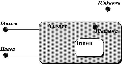 <Abb Aggregation>: Mittels Aggegation kann ein umgebendes Objekt (Aussen) ein anderes Objekt (Innen) so nutzen, daß dessen Schnittstellen nach außen so erscheinen als handelte es sich um Schnittstellen des umgebenden Objekts. Auf diese Weise ist in COM auch ohne Implementierungsvererbung die Wiederverwendung von Code möglich.