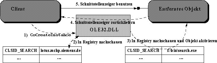 Möchte ein Client ein entferntes Objekt instanziieren, muß sich in der lokalen Registratur unter dem entsprechenden Identifikator (CLSID) ein Eintrag befinden, der den Netzwerkknoten des Zielobjekts bezeichnet. Das Laufzeitsystem des Clients und des Zielobjekts arbeiten in diesem Fall zusammen, um die gewünschte Verbindung herzustellen. Die Aktivierung des Zielobjekts erfolgt unter Kooperation der jeweiligen Service Control Manager. Hierbei handelt es sich um Systemprozesse, die bei API-Aufrufen wie zum Beispiel CoCreateInstance dazu dienen, um die Windows-Registry nach dem gewünschten Objekt zu durchsuchen, dieses gegebenfalls zu aktivieren und den entsprechenden Schnittstellenzeiger an den Aufrufer zurückzuliefern (siehe Abb : SCM).